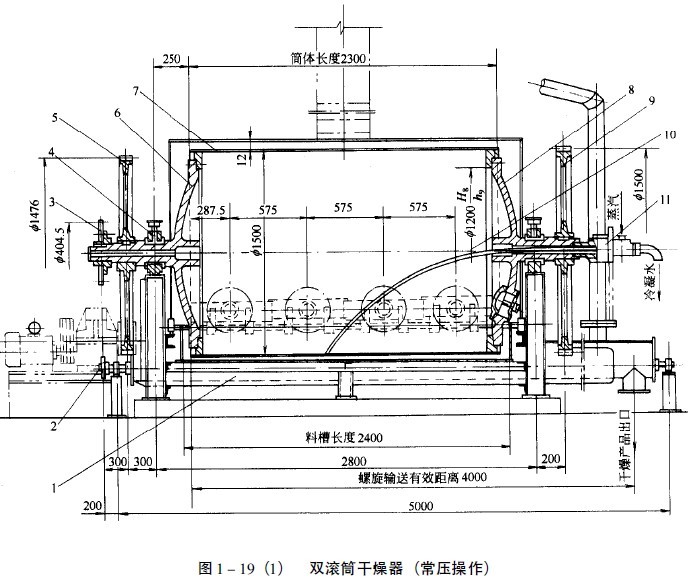 一、結構組成和總體設計 1、用于液相物料干燥的單滾筒滾筒和雙滾筒干燥設備,其結構均可歸納為以下組成部分。 (1)滾筒干燥設備的滾筒(包括筒體、端蓋、端軸及軸承)。 (2)布膜裝置(包括料槽、噴濺器、攪拌器、膜厚控制器)。 (3)刮料裝置(包括刮刀、支承架、壓力調節器)。 (4)傳動裝置(包括電動機、減速裝置和傳動件)。 (5)進氣與排液裝置(包括進氣頭和管路附件)。 (6)滾筒干燥設備支架與密封罩。 (7)干燥產品輸送和最后干燥設備。 圖1-18為常用的單滾筒干燥設備結構,圖1-19為雙滾筒干燥設備結構。 2、總體設計包括以下方面。 (1)確定滾筒干燥設備型式和筒徑、筒長及滾筒轉速根據工藝要求處理的物料量、濕含量指標,經物料和熱量衡算,在已知料膜干燥時間、蒸發強度和傳熱速率等設計參數的基礎上,確定滾筒干燥面積。依據工藝設計的流程,設備和配套在廠房的配置要求,初步確定進料、布膜、出料和供熱的方式與布置。在以上條件下,做出干燥設備的選型并計算筒體直徑、長度和轉速。在確定筒徑和轉速時,應適當留有余地,以適應物料干燥條件出現變化后的狀況。 (2)確定料槽的外形尺寸,做出布料、刮料、成品輸送或最后干燥裝置,以及供熱介質進出筒體方式的相對位置的斷面布置。 (3)確定傳動方式、減速級數和傳動件的型式,并初步估算傳動功率和傳動件的主要外形尺寸。在此基礎上,做出滾筒組件的軸向布置(包括支承方式和各傳動件的相對位置)。并結合料槽、刮料、出料、供熱裝置的布置,進行綜合調整,使之緊湊、合理,滿足操作和檢修的要求。 (4)根據蒸發物料的性質和環境狀況,確定密封罩或排氣罩的外形尺寸,并做出相應的布置。 (5)確定干燥設備各主要部件(滾筒組件和刮刀等)的材質。