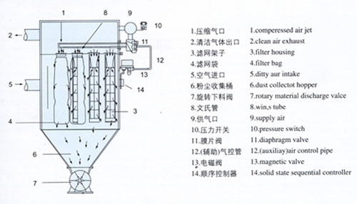 工作原理: 含塵氣流從進氣口進入下箱體后,部分沉降,輕微粉塵浮動時被濾袋阻留,凈化空氣透過濾袋,經文氏管進入上箱體,從出氣口排出。積附在濾袋外壁的粉塵不斷增加,當阻力在限定(一般為80-120毫米水柱)的范圍內,就要清除積附在濾袋外壁的粉塵,清灰是由控制儀定期順序觸發各控制閥,開啟脈沖閥,使氣包內的壓縮空氣由噴吹管孔噴出(一次風)通過文氏管誘導數倍于一次風的周圍空氣(二次風)進入濾袋,使濾袋在一瞬間急劇膨脹并伴隨著氣流的反向作用,被抖落的粉塵落入灰門經排灰閥排出機體。 應用范圍: 廣泛應用于冶金、鑄造、礦山、化工醫藥、飼料、建樹、糧食加工等行業的通風除塵和粉塵回收。
