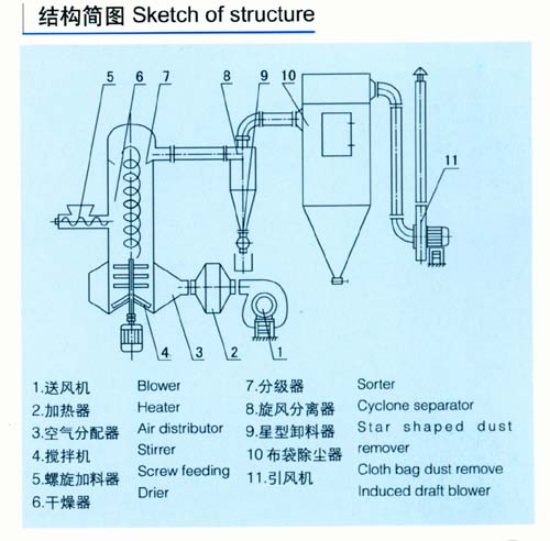 特點 本干燥機由于物料受到離心、剪切、碰撞、摩擦而被微粒化,呈高度分散狀態及固氣兩相間的相對速度較大,強化了傳質傳熱,故該機生產強度高。 干燥氣體進入干燥機底部,產生強烈的旋轉氣流,對器壁上物料產生強烈的沖刷帶出作用,消除粘壁現象。 在干燥機底部高溫區,熱敏性物料不與熱表面直接接觸,并裝有特殊裝置,解決了熱敏性物料的焦化變色問題。 由于干燥室內周向氣速高,物料停留時間短,達到高效、快速、小設備、大生產。 干燥室上部加裝陶析環及旋流片,可以控制出口物料的粒度及濕度,以達到不同物料的終水份粒度的要求。 工作原理 熱空氣由入口管以適宜的噴動速度從干燥機底部進入攪拌粉碎干燥室,對物料產生強烈的剪切、吹、旋轉作用,于是物料受到離心、剪切、碰撞、摩擦而被微粒化,強化了傳質傳熱。在干燥機底部,較大較濕的顆粒團在攪拌器的作用下被機械破碎,濕含量較低、顆粒度較小的顆粒被旋轉氣流夾帶上升,在上升過程中進一步干燥。由于氣固兩相作旋轉流動,固相慣性大于氣相,固氣兩相間的相對速度較大,強化兩相間的傳質傳熱,所以該機生產強度高。